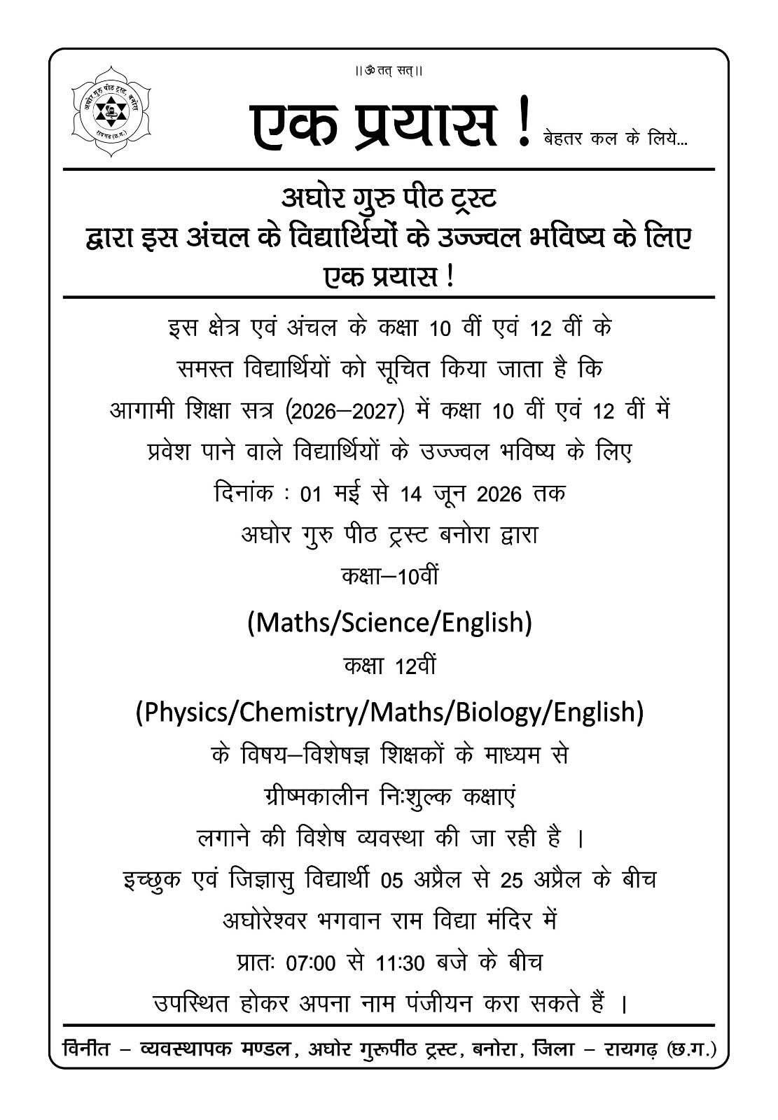 रायगढ़ (छत्तीसगढ़): विद्यार्थियों के उज्ज्वल भविष्य और शैक्षणिक स्तर को सुधारने की दिशा में अघोर गुरु पीठ ट्रस्ट, बनोरा द्वारा एक सराहनीय पहल ‘एक प्रयास’ शुरू की जा रही है। ट्रस्ट द्वारा आगामी शिक्षा सत्र (2026-2027) के कक्षा 10वीं और 12वीं के विद्यार्थियों के लिए नि:शुल्क ग्रीष्मकालीन कक्षाओं (Summer Classes) की विशेष व्यवस्था की गई है।