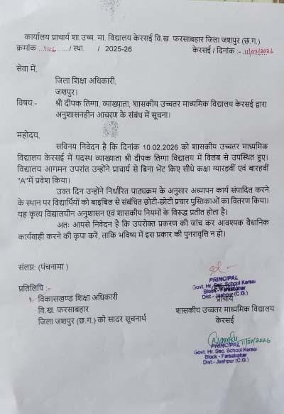 प्राचार्य कार्यालय से जारी नोटिस के मुताबिक, 10 फरवरी को दीपक तिग्गा विलंब से विद्यालय पहुंचे और बिना प्राचार्य से मुलाकात किए सीधे कक्षा में चले गए। वहां उन्होंने उपस्थित छात्र-छात्राओं को बाइबिल की पुस्तकें बांटना शुरू कर दिया था।