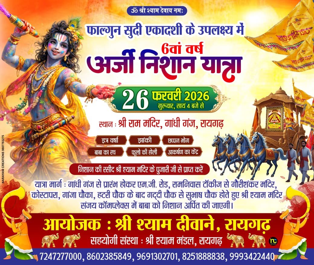रायगढ़। फाल्गुन सुदी एकादशी के शुभ अवसर पर इस वर्ष भी रायगढ़ की धार्मिक और सांस्कृतिक फिज़ा भक्ति से सराबोर होने जा रही है। 26 फरवरी 2026, गुरुवार को श्री श्याम दीवाने परिवार द्वारा 6वीं अर्जी निशान यात्रा का भव्य आयोजन किया जा रहा है, जो श्रद्धा, उल्लास और भक्ति भाव का अद्भुत संगम बनेगा।
