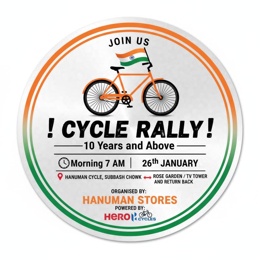 हनुमान स्टोर्स के संचालक आदित्य बेरीवाल ने बताया कि इस रैली का मुख्य उद्देश्य युवाओं और नागरिकों को स्वास्थ्य के प्रति जागरूक करना तथा प्रदूषण मुक्त यातायात को बढ़ावा देना है। तिरंगे के सम्मान में आयोजित इस रैली में शहर के सैकड़ों साइकिल सवार शामिल होकर देशभक्ति का प्रदर्शन करेंगे।