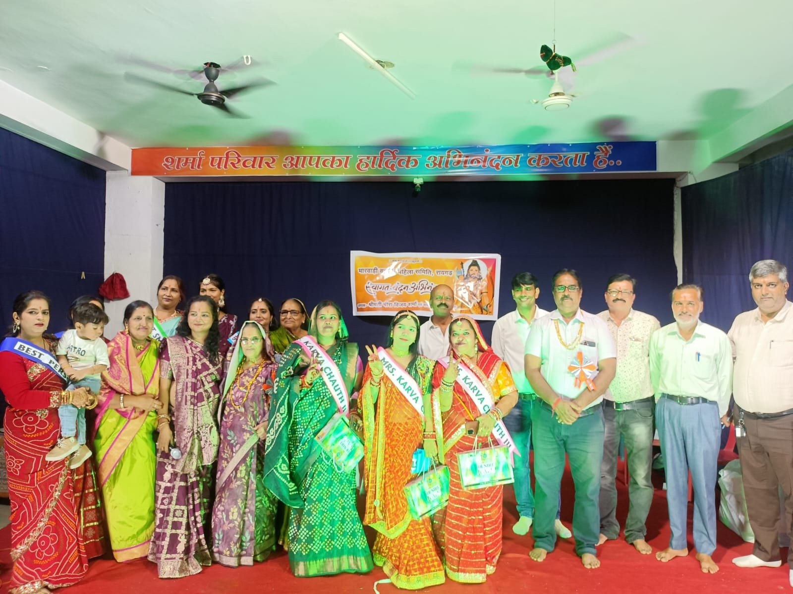 मिसेज करवा चौथ में भाग लेने वाले प्रतिभागी के नाम बबीता शर्मा, निधि नितिन शर्मा, आशा शर्मा, संगीता शर्मा, बबीता शर्मा, रूपा शर्मा, लता शर्मा, वर्षा शर्मा, संतोष शर्मा, प्रीति शर्मा, निधि मुकेश शर्मा, वंदना शर्मा, प्रिया गोपाल शर्मा, कविता शर्मा, खुशबू शर्मा, सुमन शर्मा, नीलम पांडे, तोशी शर्मा रहे एवं सभी ने मंच में आकर अपनी परफॉर्मेंस दी जिसके आधार पर जज ने अपना निर्णय लिया।