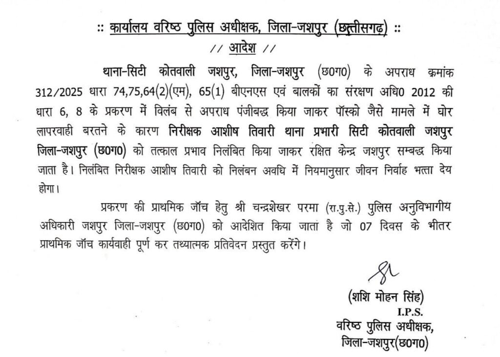 जशपुर पुलिस अधीक्षक शशि मोहन सिंह ने सिटी कोतवाली में नाबालिग लड़की से छेड़छाड़ एवं दुष्कर्म की गंभीर रिपोर्ट दर्ज करने में लापरवाही बरतने वाले टीआई आशीष तिवारी को निलंबित कर दिया है। एसपी ने राज-काज न्यूज को बताया कि बालिका दुष्कर्म का गंभीर अपराध को लेकर पुलिस की चूक बेहद गंभीर मामला है।