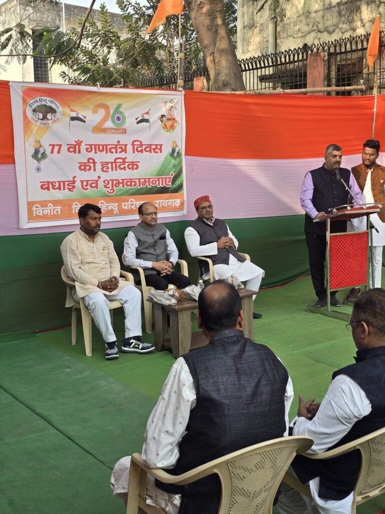 रायगढ़- 26 जनवरी – विश्व हिंदू परिषद कार्यालय श्री रामेश्वरम धाम समिति के तत्वावधान में आज 77वां गणतंत्र दिवस समारोह अत्यंत गरिमापूर्ण और उत्साहपूर्ण वातावरण में संपन्न हुआ। इस अवसर पर समिति परिसर में ध्वजारोहण के साथ-साथ राष्ट्र के प्रति समर्पण का संकल्प लिया गया।